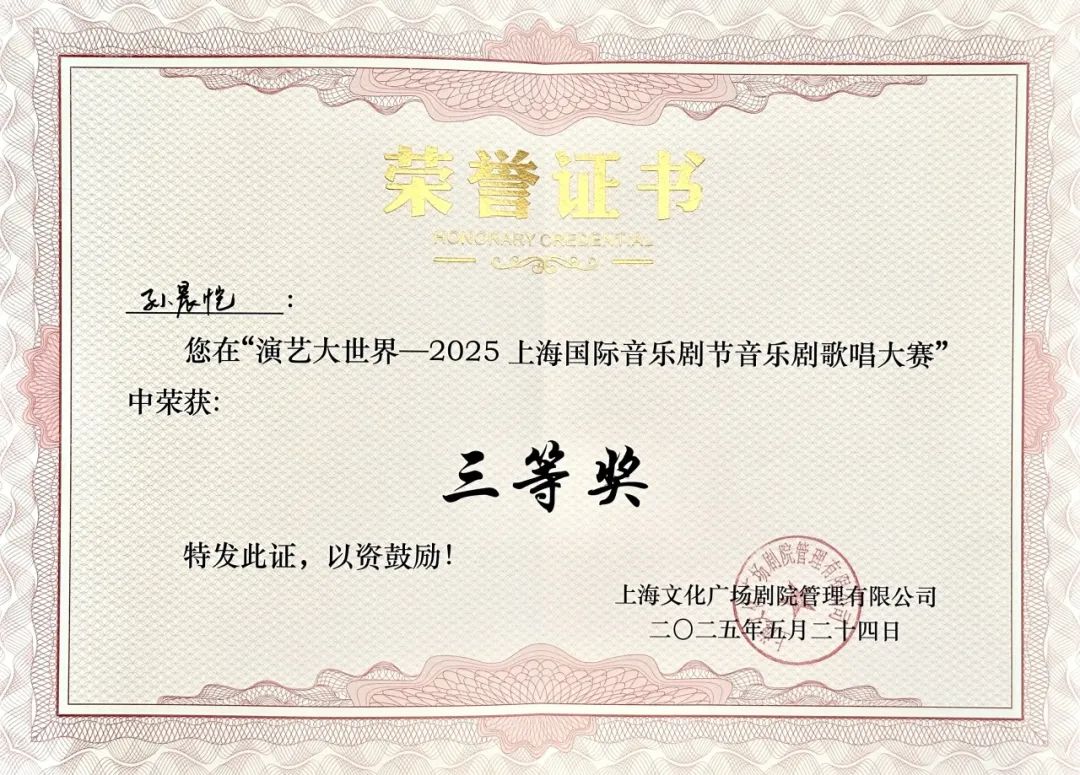 演艺大世界——2025上海国际音乐剧节音乐剧歌唱大赛决赛在上海圆满落下帷幕。本次大赛汇聚集了来自北京舞蹈学院、上海音乐学院、上海戏剧学院等高校音乐剧专业的学生、剧团声乐演员以及从事音乐剧教学的教师等同台竞技。通过为期四个月从初赛、复赛、公演、人气评选和决赛等环节的层层选拔。戏剧系学生孙晨恺脱颖而出,闯进20强。最终,音乐剧231班孙晨恺荣获三等奖(指导教师叶茂青)。