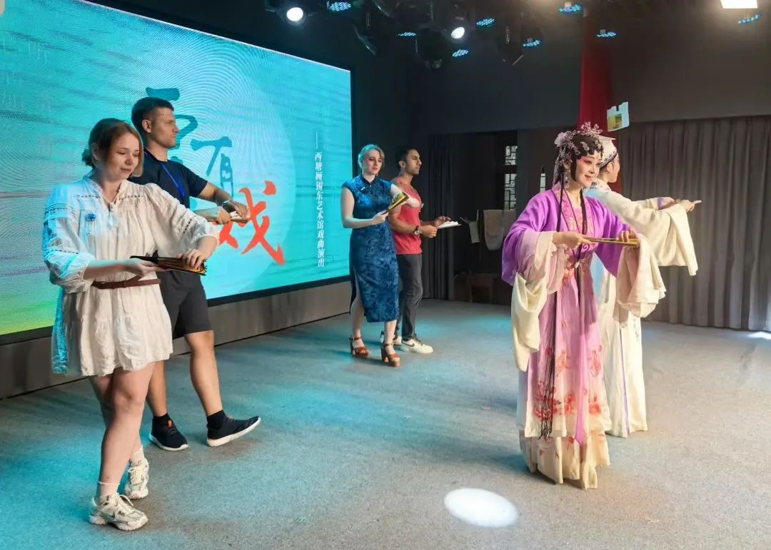 活动现场,师生同台演出了越剧《牡丹亭·幽媾》及折扇身段组合。在金彩芳教授的指导下国际学员也纷纷加入互动,反复揣摩越剧指法与身段,从执扇角度到腕部力道,每一个细节都透露出传统戏曲的独特韵味。在“一颦一笑一甩袖”中感受中国戏曲的含蓄之美。