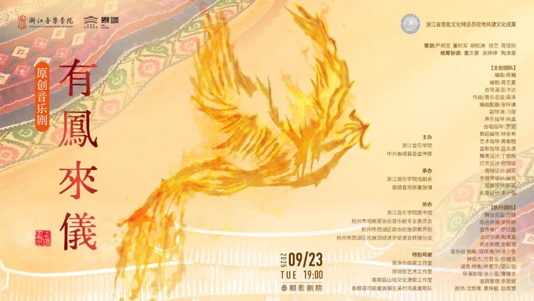 浙江省首批文化特派员校地共建文化成果原创音乐剧《有鳳來儀》将于9月23日(周二)19:00在浙江泰顺影剧院首演。