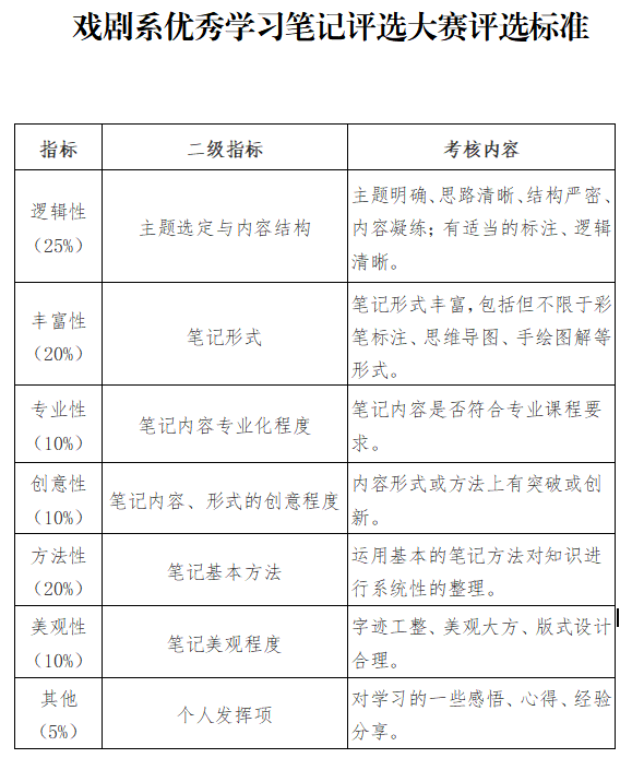 为进一步落实立德树人根本任务,提高人才培养质量,创建优良学风,挖掘学习典型,引导同学们掌握正确有效的笔记方法,提高课堂听课效果,营造良好学习氛围,促进学生成长成才,戏剧系组织开展浙江音乐学院第三届优秀学习笔记评选大赛,评选大赛系内选拔,面向全体学生征集优秀学习笔记,现将本次大赛评选规则及相关要求通知如下: